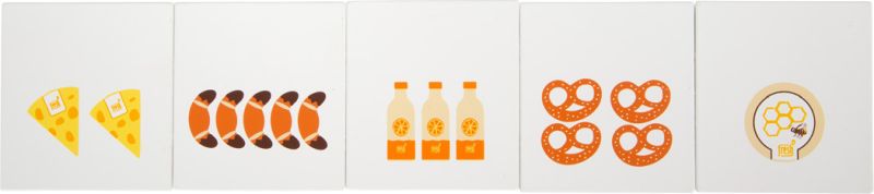 - 5 dwustronnych kartoników z kolorowymi rysunkami smakołyków – idealnych do nauki cyfr.