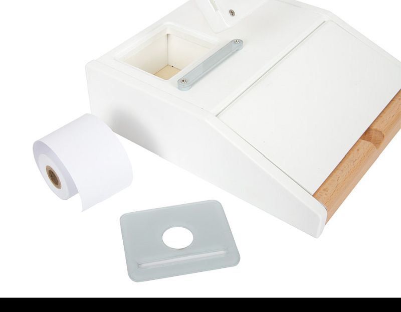 Realistycznie wyglądająca kasa fiskalna dla dzieci wykonana została z prawdziwego drewna. Ma ona podzieloną, pojemną oraz wyciąganą szufladę na pieniążki.