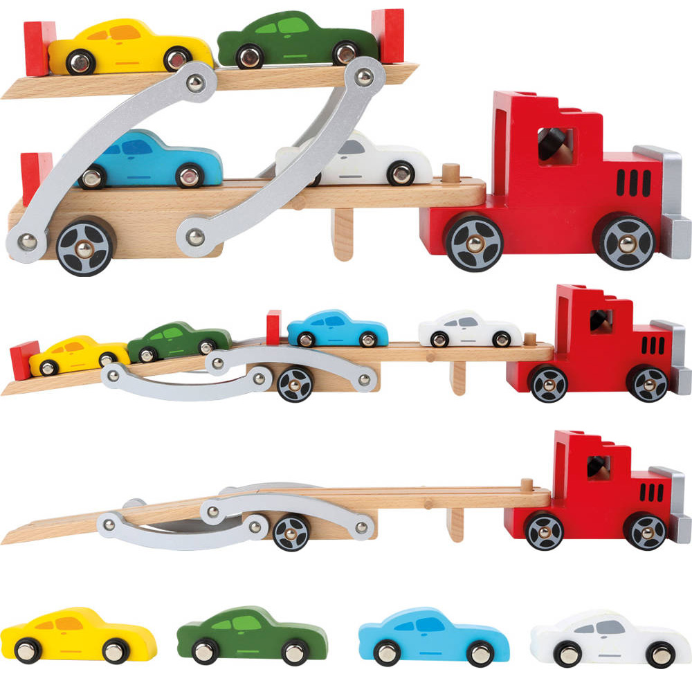 Drewniana laweta Small Foot dostarczy nowe modele samochodów do kącika zabaw każdego miłośnika pojazdów. Cztery kolorowe autka mogą wygodnie wjechać na dwupiętrową lawetę, która jest rozkładana, a barierki na jej brzegach zabezpieczają autka przed spadnięciem. Przyczepa jest połączona z czerwoną ciężarówką, która czeka na wyruszenie w długą podróż.