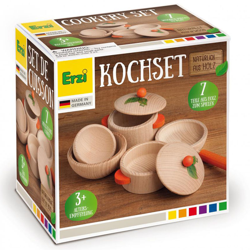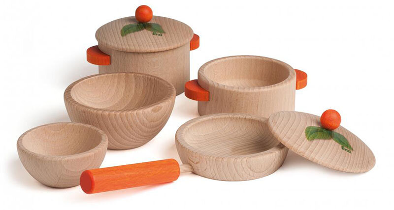 Niezbędny podczas zabawy w gotowanie zestaw drewnianych naczyń Nature marki Erzi to spełnienie marzeń każdego małego szefa kuchni. Elementy zestawu wykonane zostały z wysokiej jakości drewna buku. Zestaw zawiera: 1 duży garnek z pokrywką, 1 mały garnek z pokrywką, 1 patelnię, 1 dużą miskę oraz 1 małą miskę. Zestaw został wyprodukowany w Niemczech oraz posiada certyfikaty bezpieczeństwa CE oraz ASTM.