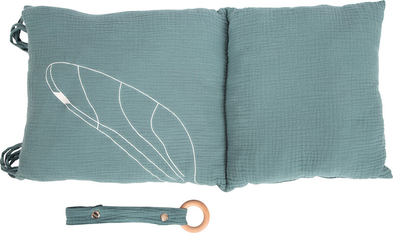 Widoczne drewno i inne naturalne materiały oraz modny, przydymiony niebieski kolor sprawiają, że ten hamak dla dzieci przyciąga wzrok! To jest właśnie to, co sprawia, że dzieci są zrelaksowane i zadowolone! Zaokrąglone krawędzie drewna i ich miękkie kształty zapewniają przyjemne wrażenia dotykowe i duże bezpieczeństwo. Zdejmowaną poduszkę można przymocować do huśtawki za pomocą pętli. Wciskany przycisk zabezpiecza zabawkę/gryzak, a do huśtawki można przymocować również inne akcesoria, takie jak smoczek lub zabawki.