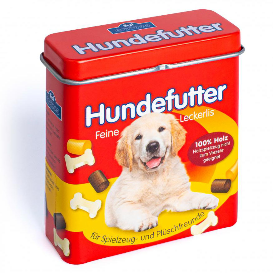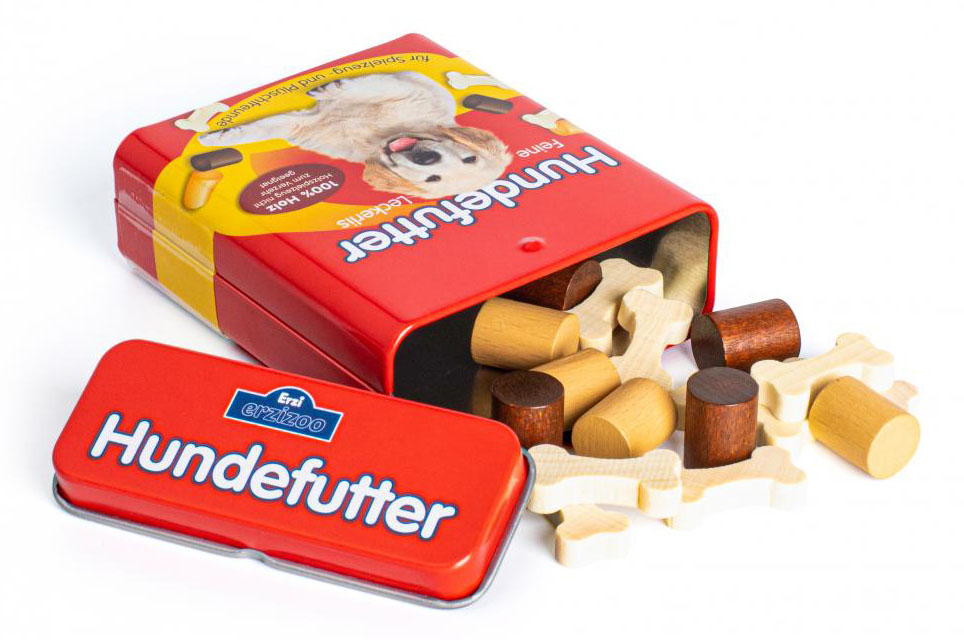 Drewniane smakołyki dla psa w puszce marki Erzi wzbogacą zabawę w sklep lub tresurę zwierzaka. 16 wykonanych z drewna buku przysmaków ma różne kształty oraz realistyczny wygląd. Opakowanie stanowi praktyczna puszka ze zdejmowaną pokrywką. Zabawka została wyprodukowana w Niemczech oraz posiada certyfikaty bezpieczeństwa CE oraz ASTM.