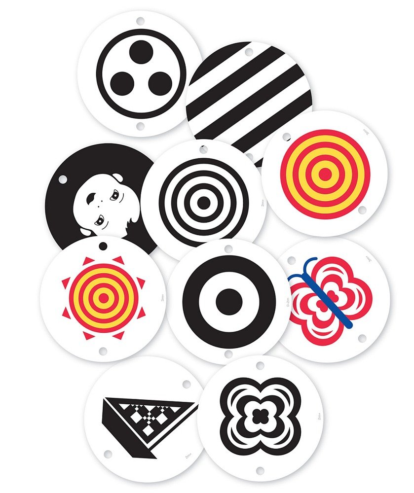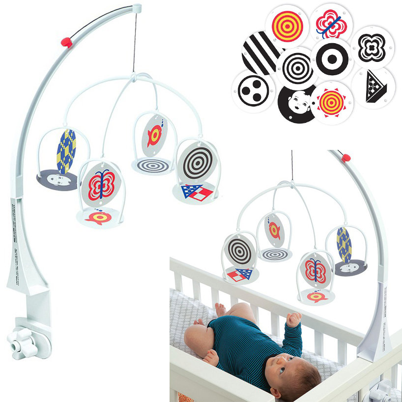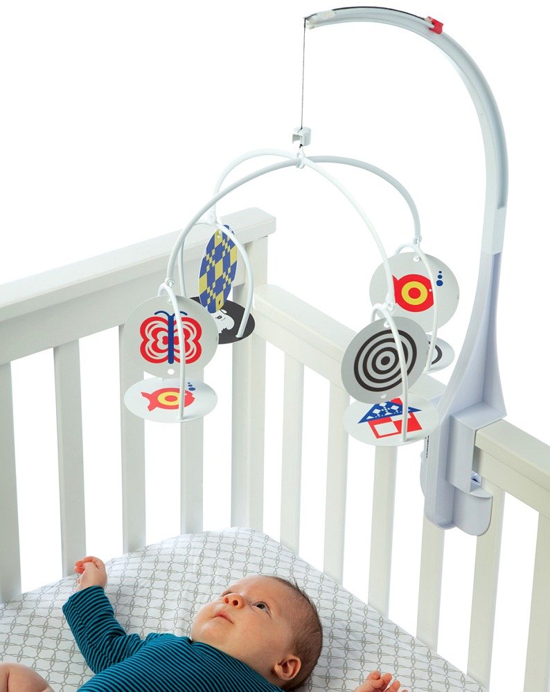 Karuzela z elementami o dużym kontraście obrazów i kolorów dla niemowląt zawiera 10 wymiennych kart graficznych do wykorzystania w miarę rozwoju dziecka (0-5 miesięcy). W zestawie z regulowanym uchwytem.