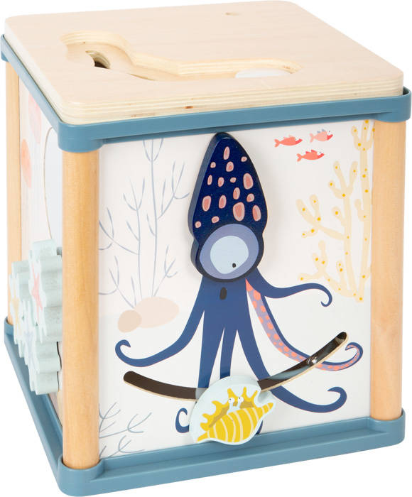 Kostka motoryczna Podwodny świat Small Foot zachęca maluchów do aktywności. Dzięki dwóm labiryntom z koralików, grze dopasowującej kształty, przesuwanemu labiryntowi, obracającym się płytkom i grze z kołami zębatymi na pięciu ścianach, ta kostka do aktywności ruchowej wykonana ze stabilnego drewna jest nie tylko wszechstronna, jeśli chodzi o zabawę i odkrywanie, ale także przyciąga wzrok. Dodatkowo kostka zawiera grę w łowienie rybek, które wraz z wędka znajdują się w jej wnętrzu. Morskie stworzenia, które towarzyszą młodym odkrywcom ze wszystkich stron sześcianu, pobudzają ciekawość i zapewniają długotrwałą zabawę. Zdejmowaną pokrywę można przechowywać do góry nogami wewnątrz kostki, dzięki czemu zmieści się na dowolnej półce w pokoju dziecięcym i zaoszczędzi miejsce. Ta kostka aktywności ruchowej ćwiczy percepcję kształtów i kolorów, zręczność i zdolności motoryczne, poprawia koordynację ręka-oko oraz inspiruje wyobraźnię.
