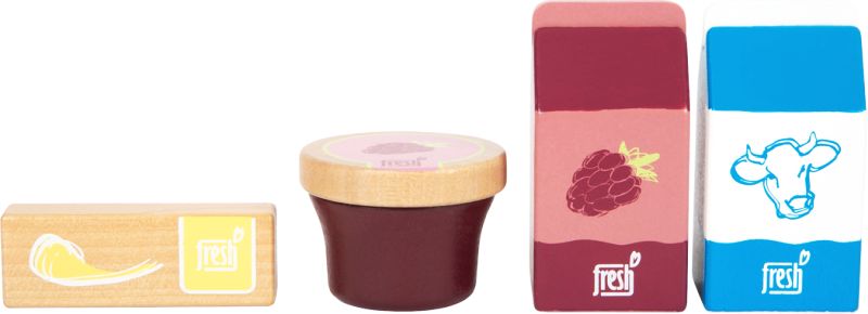 - akcesoria imitujące przekąski w postaci: gofrów, kawałka tortu, rogalika, kromek chleba, sera, owoców, masła, jogurtu oraz napoju owocowego i mleka.