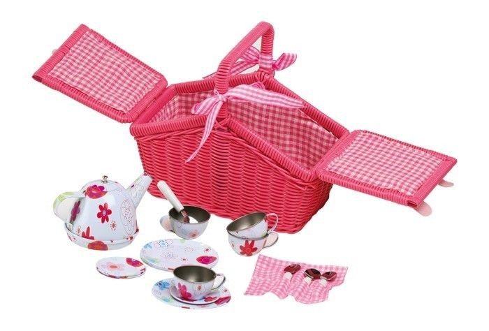 Śliczny, pleciony koszyk w stylu lat 70 -tych. Zawiera zestaw blaszanych naczyń stołowych. Nieodzowny do wypadów z lalkami.