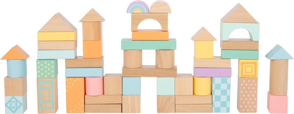 Klasyka w totalnie modnych kolorach! Ten 50 częściowy zestaw drewnianych klocków konstrukcyjnych zachwyca młodych, aspirujących mistrzów budownictwa, oferując duży wybór różnie ukształtowanych drewnianych klocków w delikatnych pastelowych kolorach. Dzieci mogą puścić wodze fantazji i trenować zdolności motoryczne podczas budowania i układania klocków. Klocki są wykonane z wysokiej jakości drewna i mają szczególnie przyjazne dzieciom wzory.