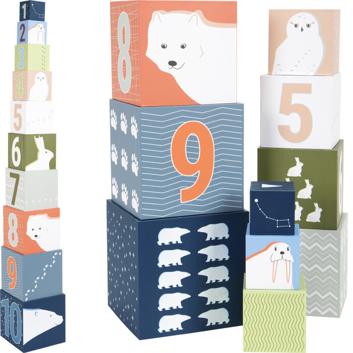 Pudełkowa piramida do układania wieży Arktyka to kolejna propozycja klasycznej zabawki od Small Foot. To w sumie 10 kartonowych (FSC) pudełek o zróżnicowanej wielkości, które po prawidłowym ułożeniu pozwolą uformować dziecku cudowną wieżę. Ta wyjątkowa wieża do układania posiada olbrzymią wartość edukacyjną. To doskonały pomysł na rozwojowy prezent dla każdego dziecka od 12 miesiąca życia.