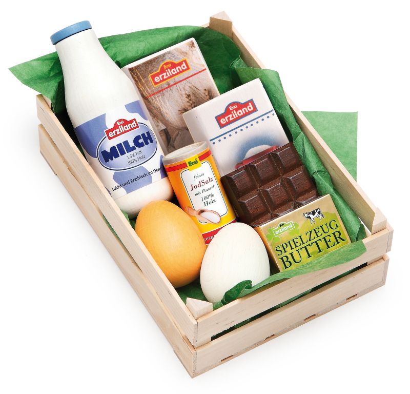 W skrzyneczce Erzi znajdziemy mąkę pszenną, cukier, sól, mleko, czekoladę, masło oraz dwa jajka białe i brązowe (8 elementów). Elementy zabawki wykonane z drewna.