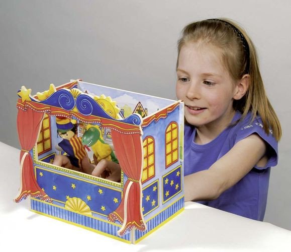 Teatrzyk drewniany i cztery tła w zestawie. Kompatybilny z pacynkami na palec.