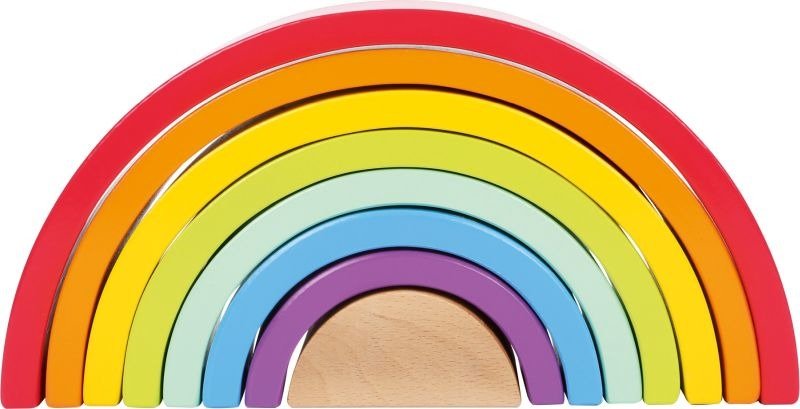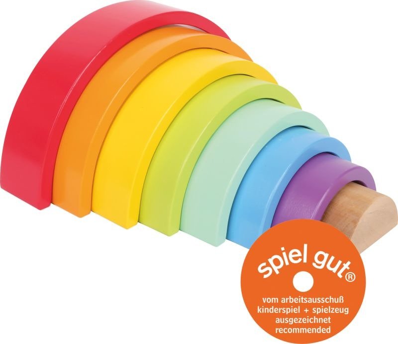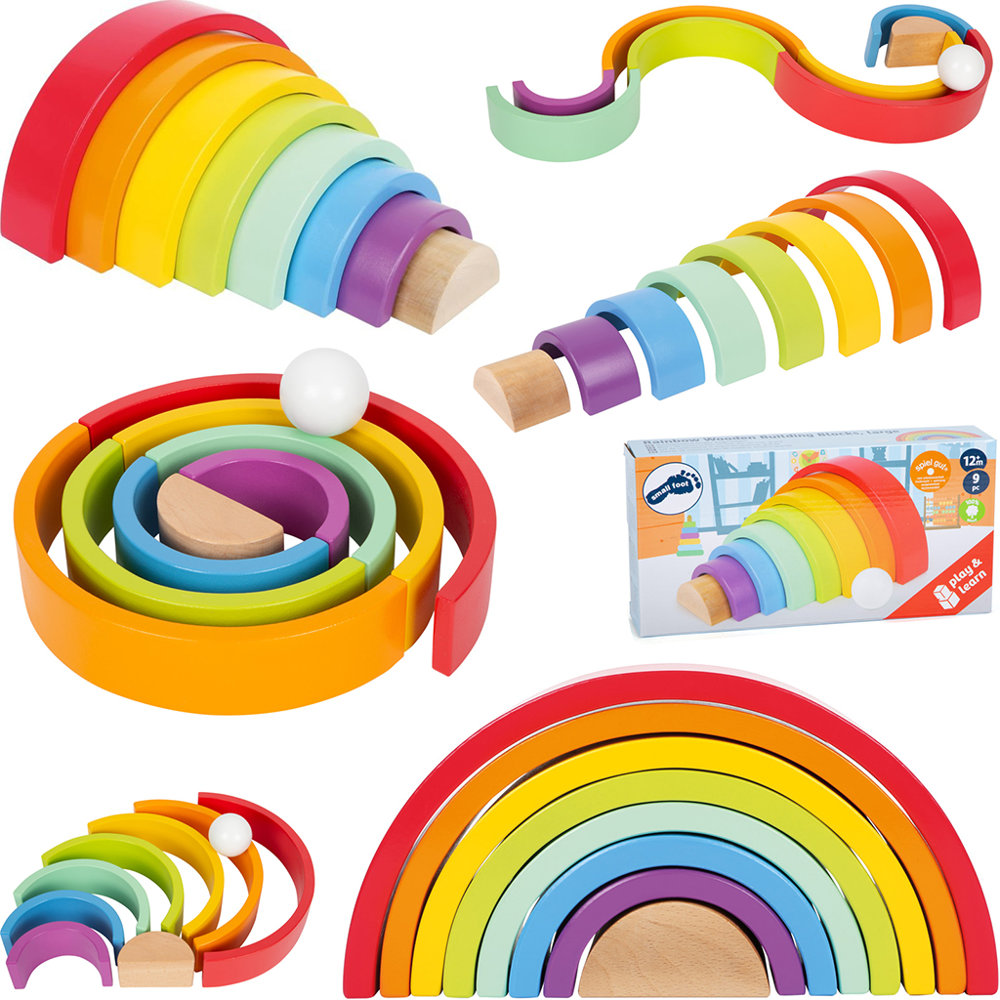 8 barwnie lakierowanych, w kształcie półkola klocków to następne wyzwanie dla małych rączek. Zabawa uczy rozpoznawania kształtów i kolorów, rozwija zdolności manualne!