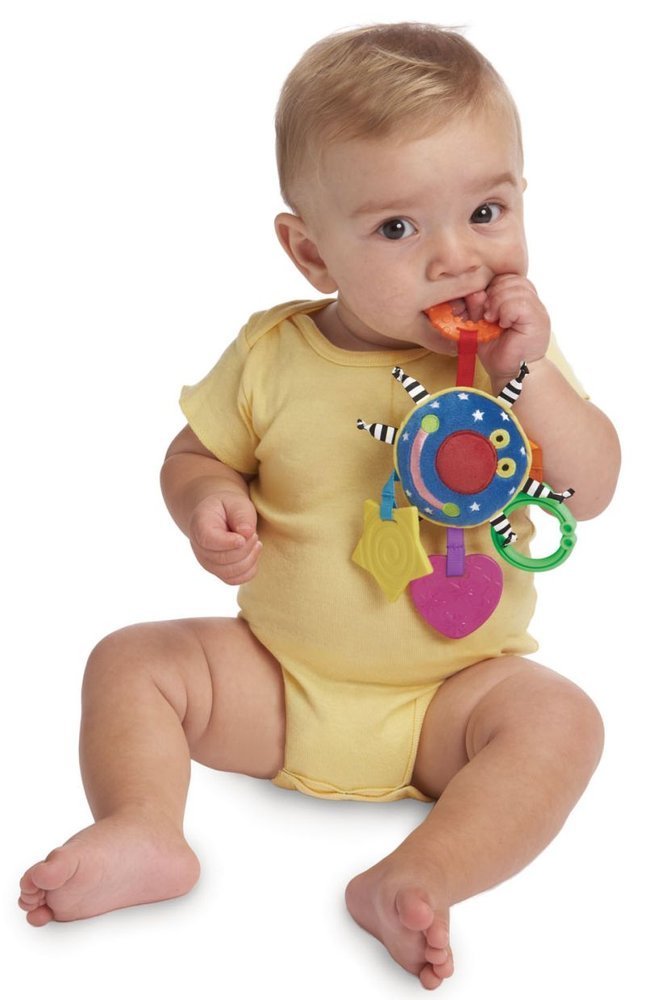 Zabawny gryzak Whoozit jest idealnym wyborem w podróży. Plastikowy klips C umożliwia łatwe mocowanie do wózków dziecięcych, fotelików samochodowych i nosidełek. Posiada trzy kolorowe, teksturowane gryzaki, które łagodzą ból dziąseł w czasie ząbkowania. Zabawka idealna do zabawy i żucia.
