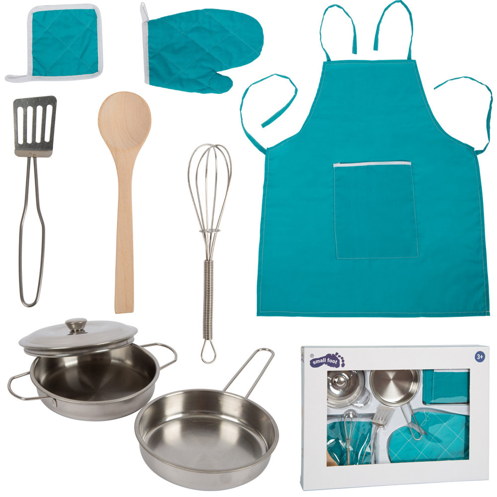 Wyjątkowy zestaw do gotowania z fartuchem Small Foot sprawi, że młodzi kucharze będą wyglądać jak kulinarni zawodowcy. Zawiera metalowy garnek z pokrywką, patelnię, trzepaczkę, szpatułkę, drewnianą łyżkę, materiałowy fartuch kuchenny wraz z rękawicą i podkładką pod garnek. Niebieski fartuch posiada dużą, praktyczną kieszeń, w której zmieszczą się przybory kuchenne, a miłośnicy gotowania będą mieli zawsze wolne ręce. Odgrywanie ról w czasie zabawy rozwija kreatywność, wyobraźnię i umiejętności społeczne.
