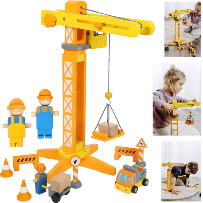 Precyzyjnie wykonany, z solidnego drewna masywny Żuraw Stanisław marki Small Foot, pozytywnie wpływa na koordynację wzrokowo-ruchową dziecka. W skład zestawu wchodzą: pokaźny żuraw z możliwością obrotu 360 stopni, ruchomym wysięgnikiem oraz haki zabezpieczające do transportu. Dzięki słupkom, znakom oraz blokadzie dróg, można zabezpieczyć teren budowy. Za pomocą korby, ładunek znajdujący się na platformie zostaje opuszczony, przez operatora znajdującego się w kabinie. Wszystko jest pod kontrolą!